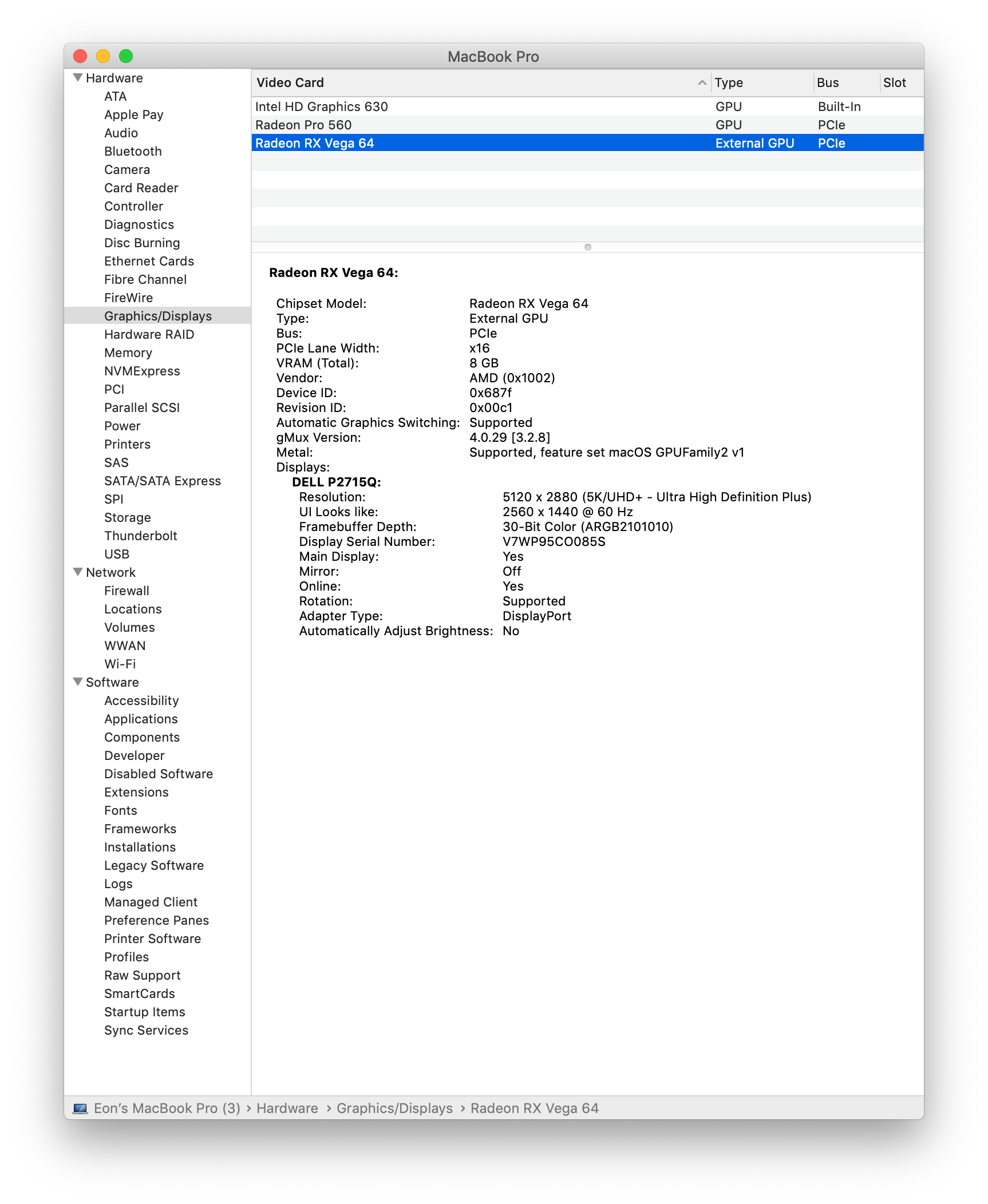 맥북 프로 <--썬더볼트3케이블--> 아키티오노드프로 <PCIe> VEGA64 <--DisplayPort케이블--> 4K 델 모니터 (P2715Q)