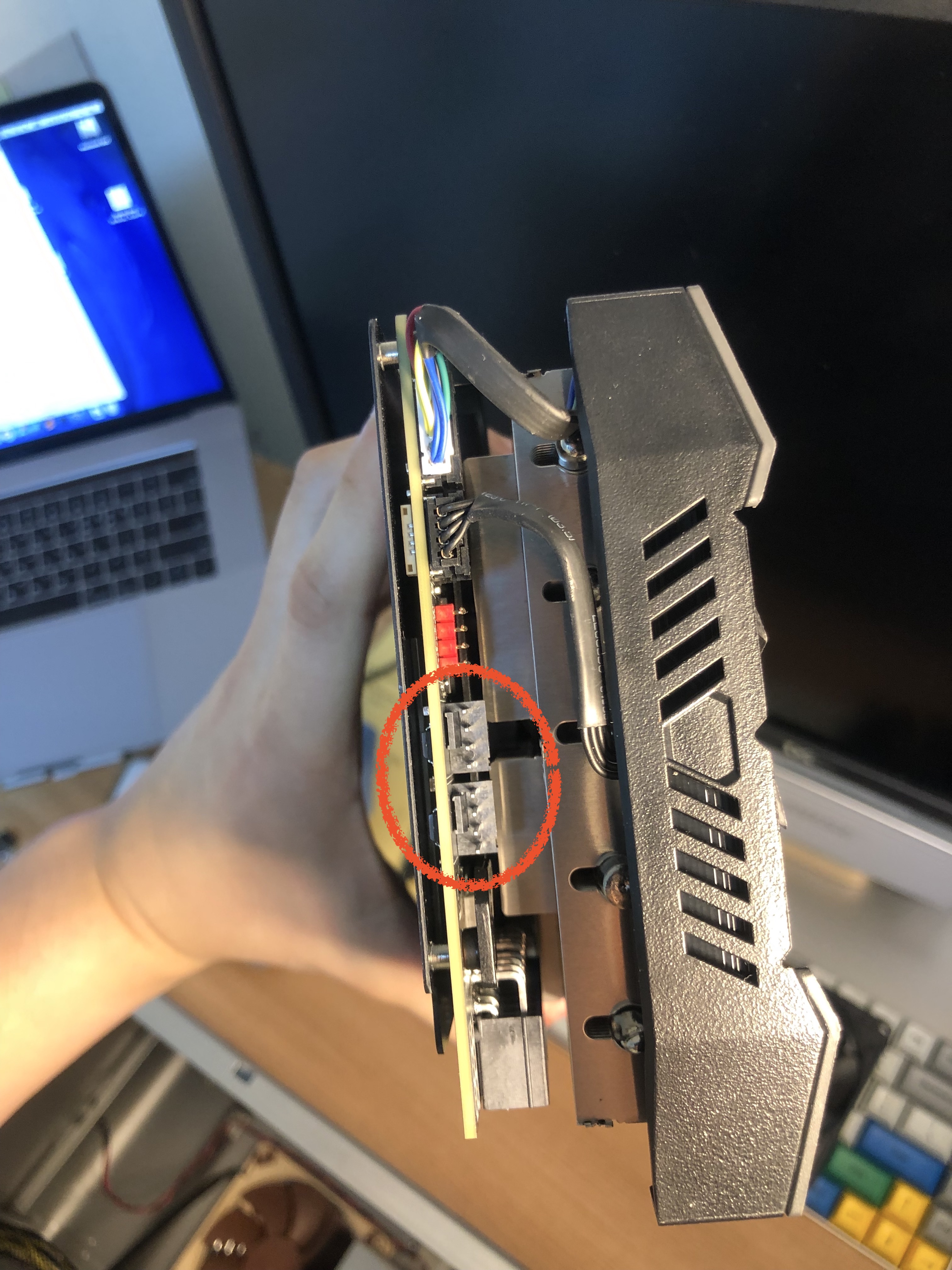 이 그래픽카드는 좋은 점이 GPU에 온도에 따라 팬을 컨트롤할 수 있는 팬 2개를 장착할 수 있는 4핀 허브가 있습니다.