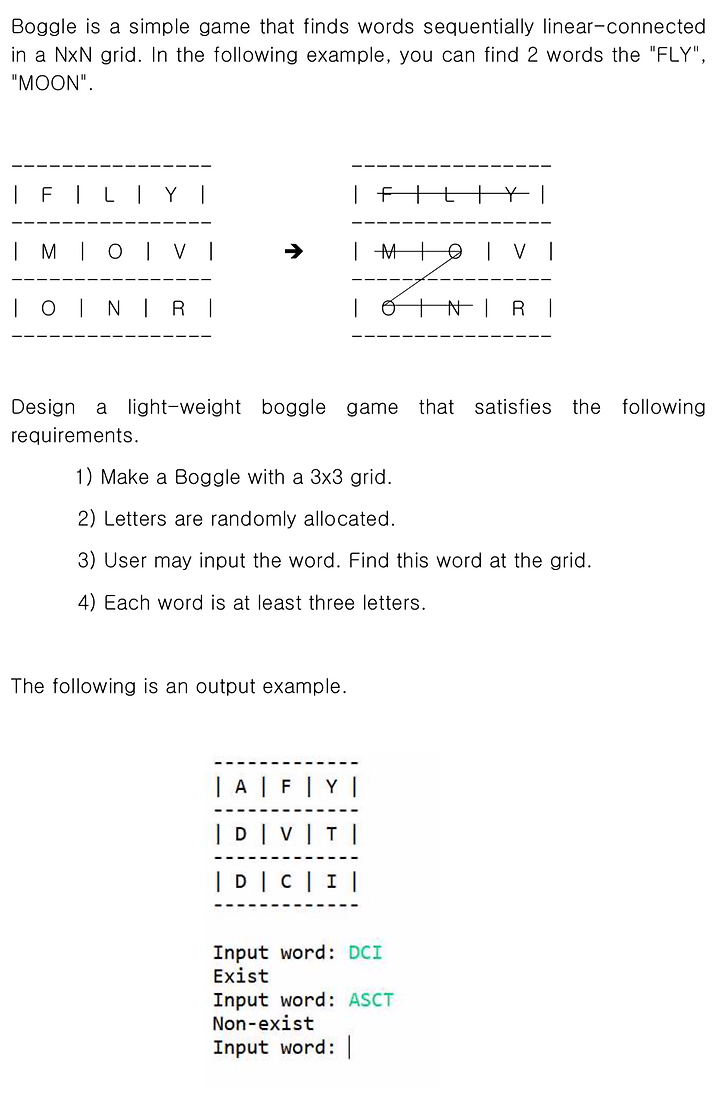 그리고 print_boggle()함수를 수행하여 3*3 배열을 보기좋게 출력한다. 그리고 무한 루프에 들어가 사용자부터 단어를 입력받는다. 입력이 유요한 입력인지 확인을 한다. 3~9 사이의 캐릭터 스트링인지 확인 후에 단어를 찾는다. 시작하기전에 clone을 이용하여 동일한 배열을 복사하여 진행한다. 첫 starting point를 찾은 후에 그 char를 삭제를 한다. 그리고 near_char()함수를 실행하여 현재 시작점의 위치를 입력받아 그 주변 인접 char를 찾는다. 만약 찾으면 string에서 맨 앞 char를 삭제한다. 그리고 다시 첫번째 stringd을 찾는다. 만약 모두 찾을 경우 string의 length는 0이 되고 Exist를 출력한다. 만약 중간에 char를 찾지 못하거나 starting point를 찾지 못할경우 false를 함수에서 출력하고 non-exist를 출력한다.